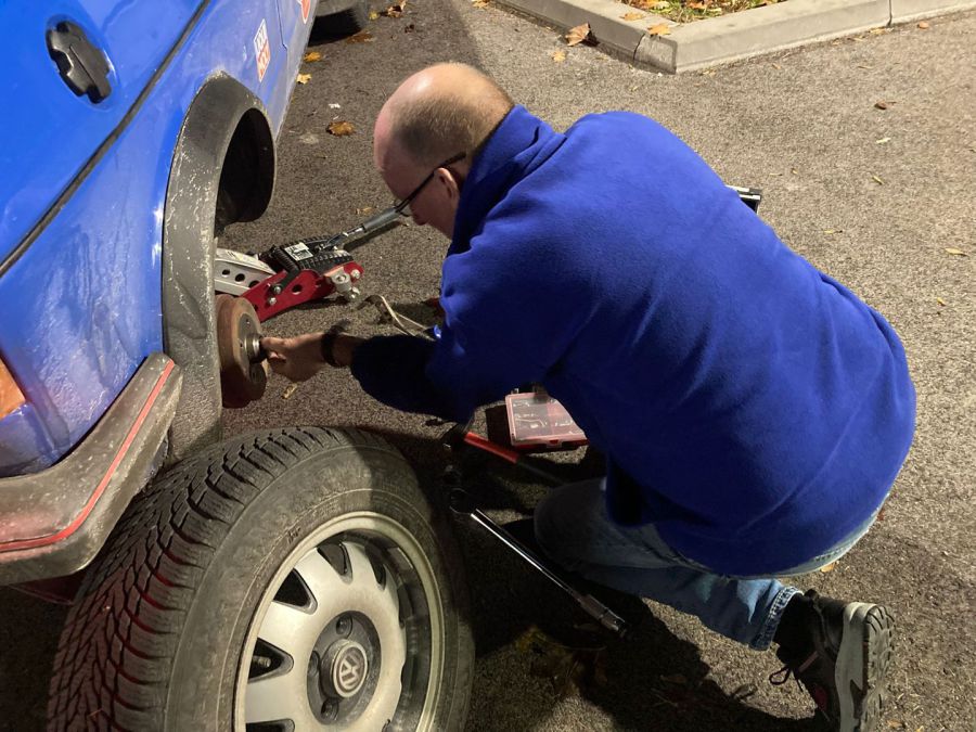 Im Ziel angekommen wird kurz das Radlager der rechten Hinterachse nachgestellt. Es verabschiedet sich langsam nach nur 8.000 km. Das zeigt, welcher Belastung ein Rallyefahrzeug ausgesetzt ist - oder liegt's an Heikos Fahrstil ??